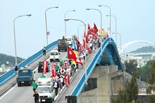 米軍は、去る9月 24 日、パトリオット・ミサイル配備に伴う、大型車両 500 台をはじめとする山のような関係物資を那覇軍港に陸揚げし、国道 58 号線を使って嘉手納基地までの大輸送劇を繰り広げました。そして 10 月9日には、うるま市天願桟橋にミサイル本体を積み込んだ貨物船を接岸させ、 11 日には桟橋ゲート前でミサイル搬入に反対して座り込んだ労働団体、平和団体などの市民を県警機動隊を導入・排除して嘉手納弾薬庫へ運び入れました。
